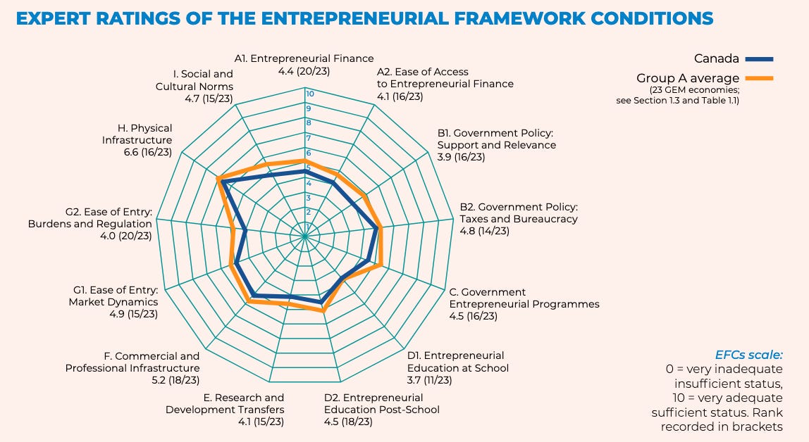One perspective is that regulatory barriers for new entrants are too high, making it harder than necessary for entrepreneurs to launch and for some succeed. And in fact, one frequently-cited international benchmarking report on entrepreneurship notes that Canada’s regulatory barriers to entry are less conducive to new start-ups than comparable countries, though I note that “government bureaucracy” is not so much of a problem. However, a lot of new small businesses don’t make it, and not because the regulatory environment was the problem.