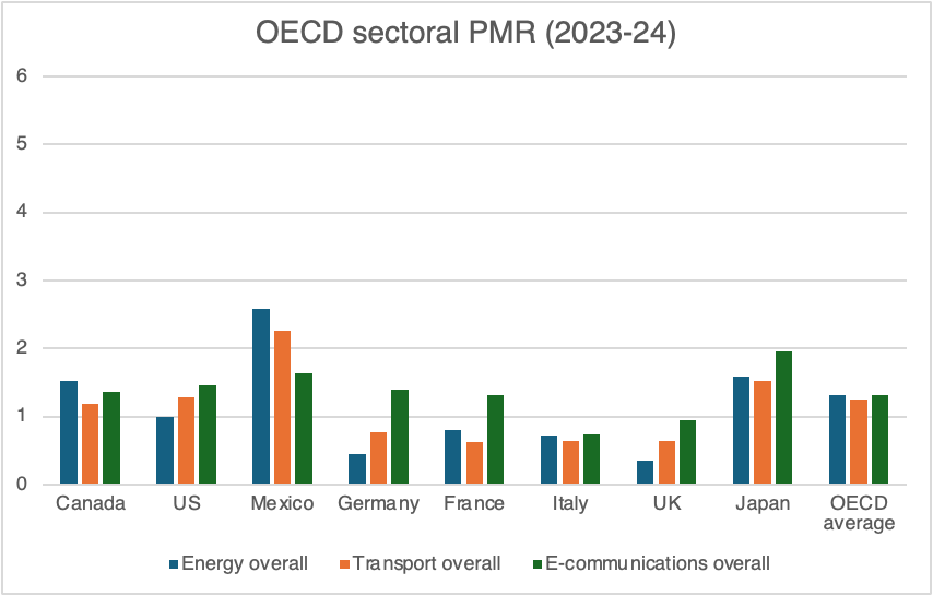But what about the sectoral-level results? The OECD reports on regulatory stringency for each energy, transportation and telecommunications (they call it e-communications) sectors. Below is a chart I’ve generated, using the same 2023-24 annual PMR data, and compared to selected countries, but at the sectoral level. In this case, I’ve chosen G-7 countries, the OECD average, and Mexico, given that regional and sectoral comparisons seem to matter to investment decisions.