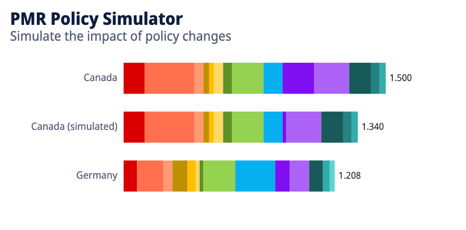 The simulator covers several different policy domains that might create red tape burdens on business entry and competition. I chose to run the simulation squarely focused on the kinds of national regulatory burdens that C-15 and current text of The Red Tape Reduction Act are intended to tackle. You can see the impact visually as the dramatic reduction in the dark purple section of the overal PMR score. This reflects changes like: