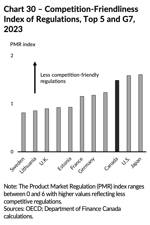 So, whether a government wanted to pursue smart deregulation to encourage new entrants or to encourage more innovation and investment, I think it’s fair to say that the international benchmarking data suggest there’s room for improvement, but maybe not an emergency that could otherwise tank Canada’s efforts to chart a new economic and geopolitical course.